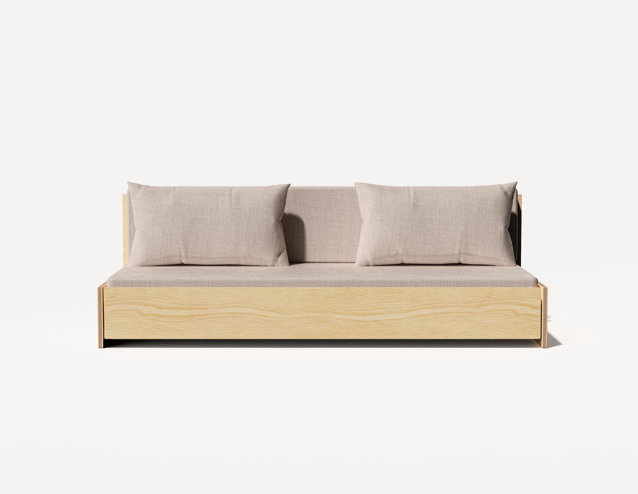 Just remove the cushions, pull the seat section forward, and fold down the backrest to reveal a full-size double bed.