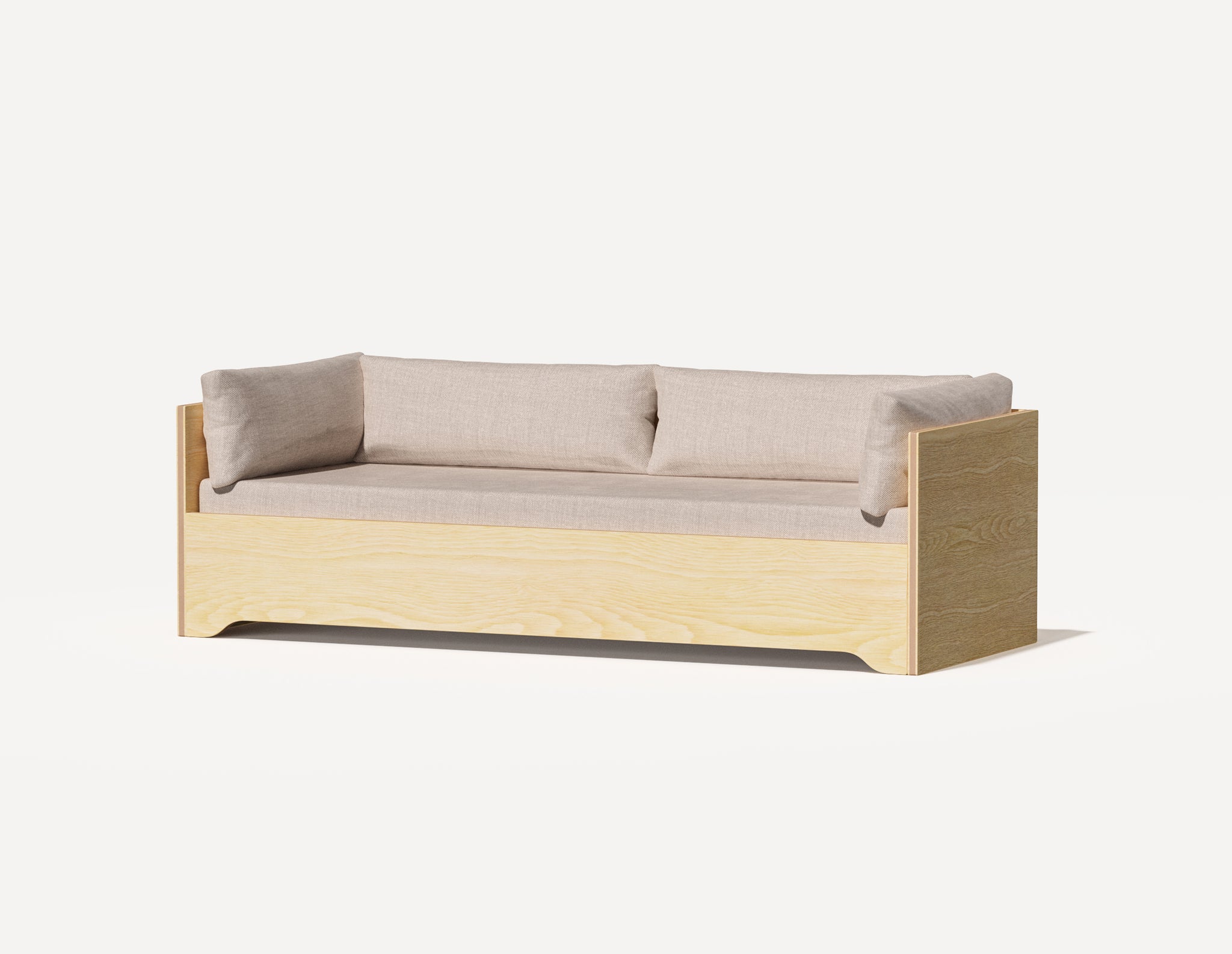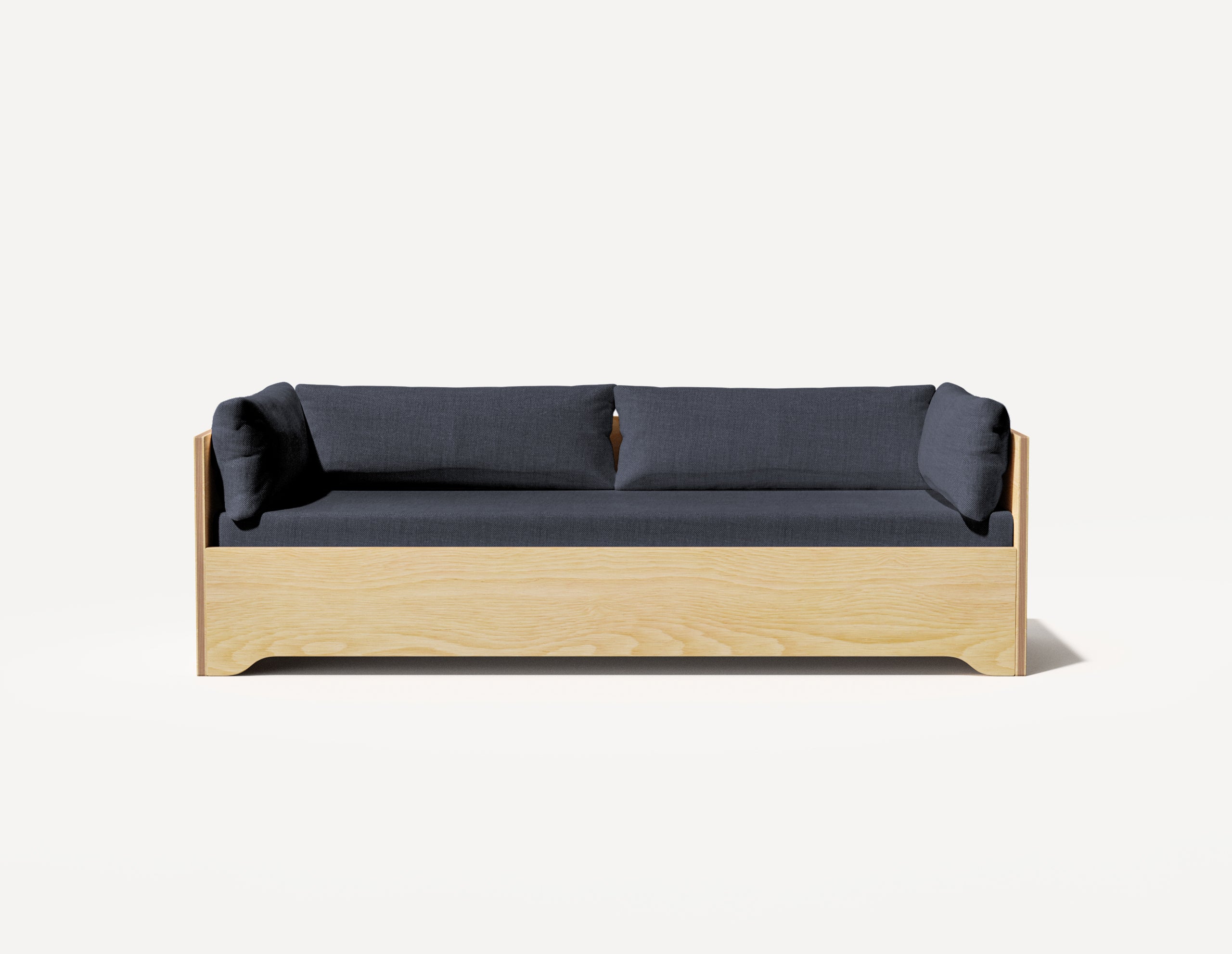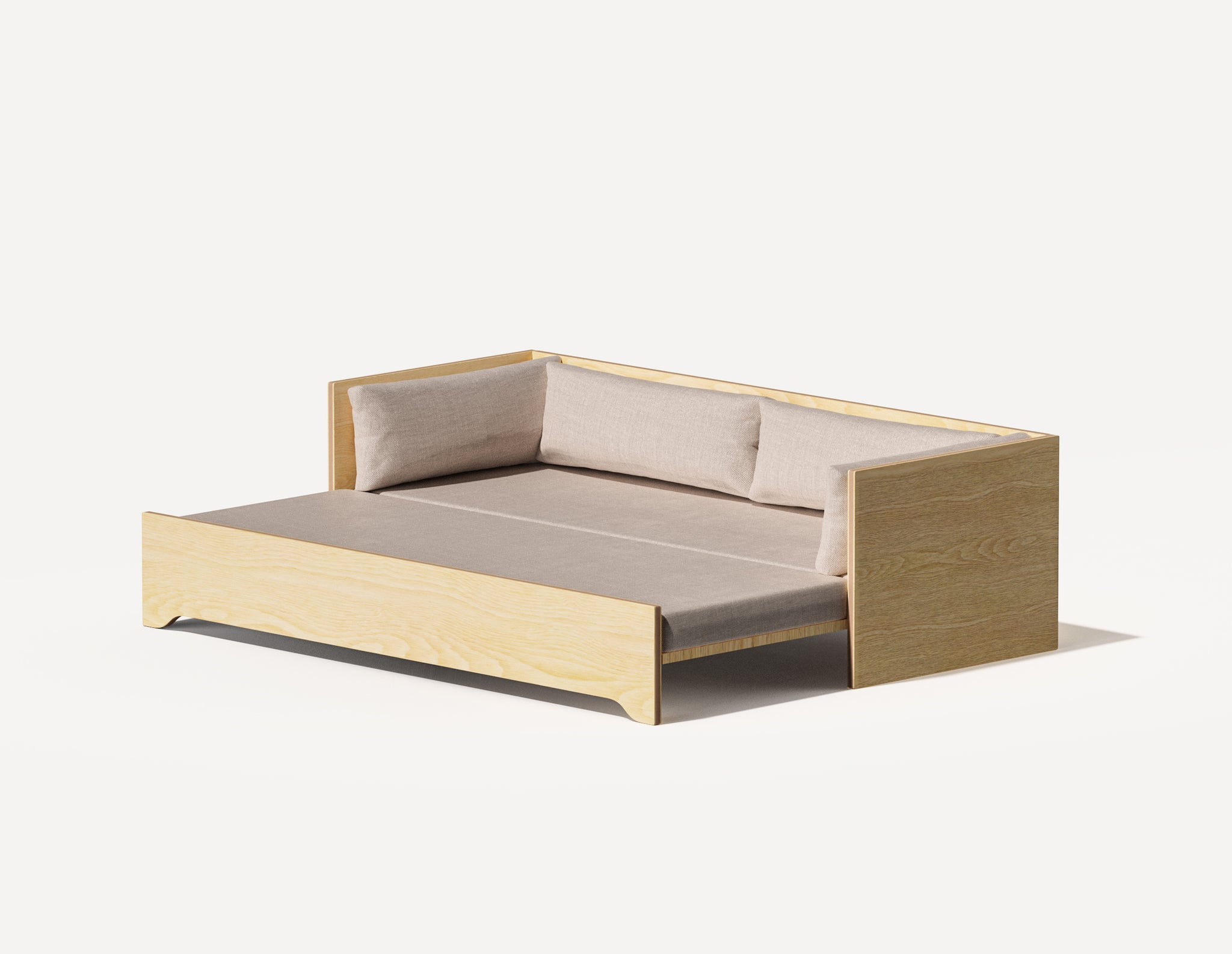 Influencé par les principes du design danois et japonais, voici notre version d'un canapé-lit trois places polyvalent du milieu du siècle. Ce canapé offre un espace généreux et compact, pouvant accueillir deux adultes côte à côte, et dissimule un lit double discret.